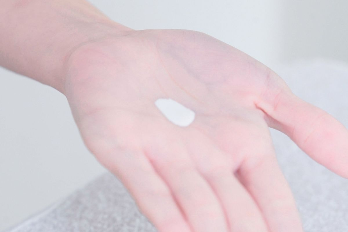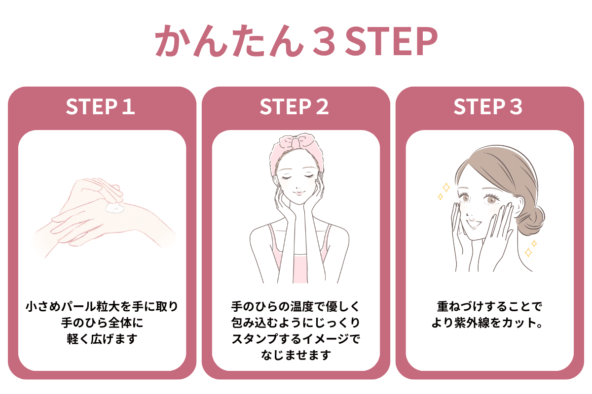 使い方 ①小さめのパール粒を手のひらにとり、軽く手のひら全体に広げます。 ②お顔全体を包み込むようにゆっくりなじませます。