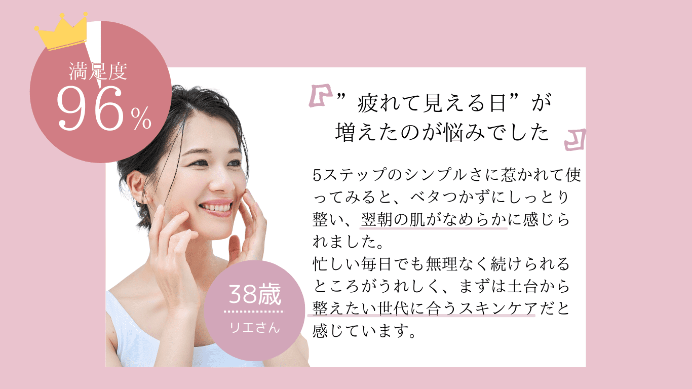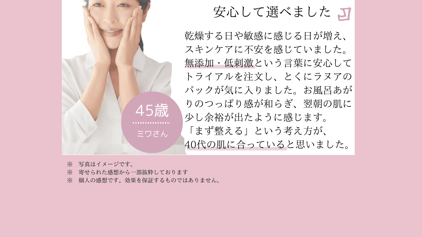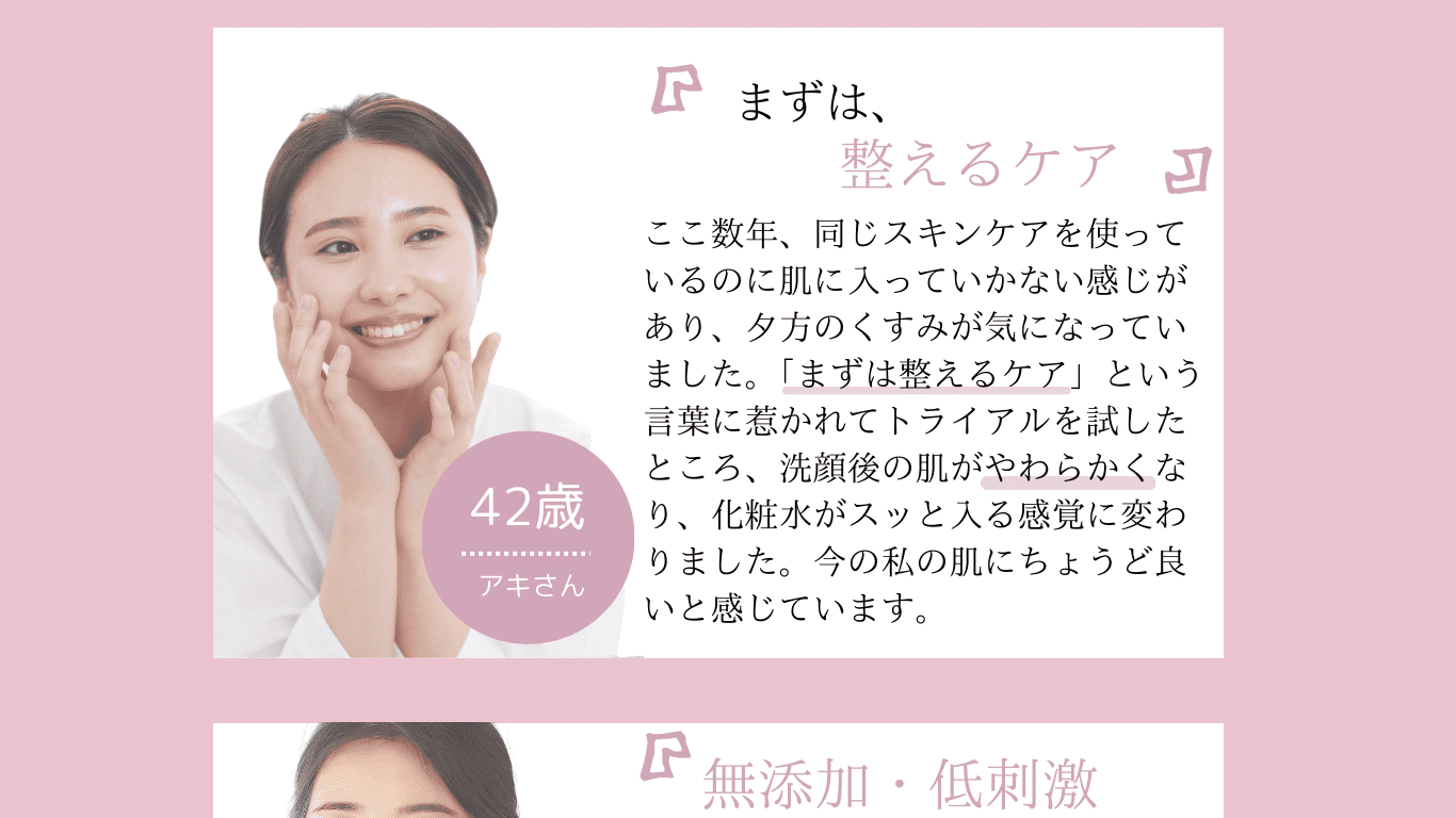頬のくぼみやくすみが悩みでした。初めはトライアルセットにパックがついてる?!と驚きましたが、順に使ってみると、化粧水や美容液の馴染みが良い!使い始めて3ヶ月経ったころから、頬がふっくらし、パっと明るいツヤツヤした肌になりました。(45歳/女性/敏感肌)