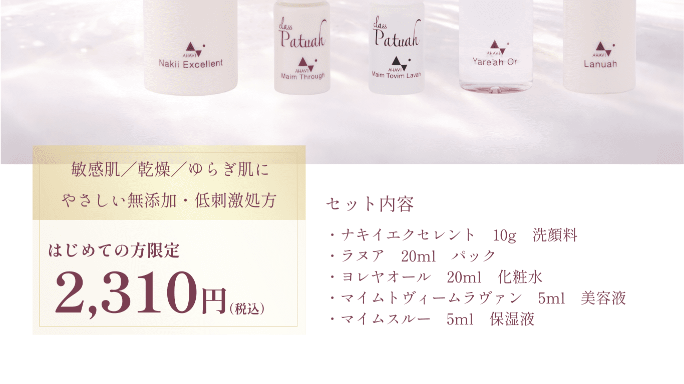 とても敏感肌でなんだか首がカサカサしたり、痒みがでたり悩んでいました。そんな時、アハヴィー化粧品に出会ってこのサンプルを試しました。無香料で不快感もなく、安心して使えました。特に洗顔は洗うとパっと顔色が明るくなりますね。(42歳/女性/敏感肌)